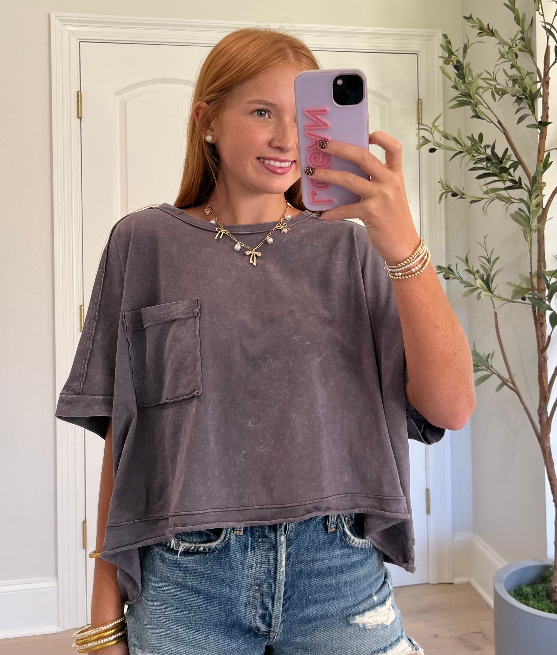 The Mineral Washed Oversized Crop Top offers soft, comfy wear with a relaxed fit and 90’s-inspired dolman sleeves. Its casual design, featuring a dropped shoulder and a pocket, makes it easy to style for everyday wear or dress up for gameday.